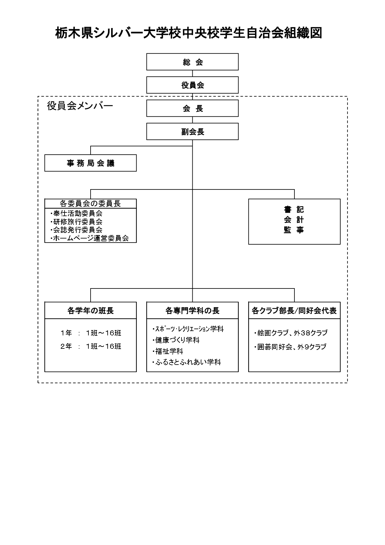 栃木県シルバー大学校中央校学生自治会(以下「本会」という。)は、中央校の全学生を会員とする学生の自治組織で、会員相互の親睦、交流を深め学習活動の円滑な運営に協力し、かつ、自主的学習活動を通じて学生生活の意義を高めることを目的にしています。その目的を達成するためにクラブ・同好会活動に関すること、各委員会活動に関すること、学校祭に関すること、地域社会活動への実践参画に関すること及びその他必要と認められる事業を主催しています。