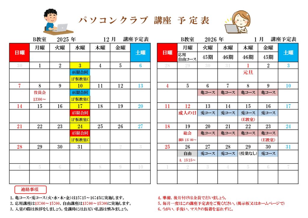 パソコンクラブ講座予定表(12月-1月)を掲載しました