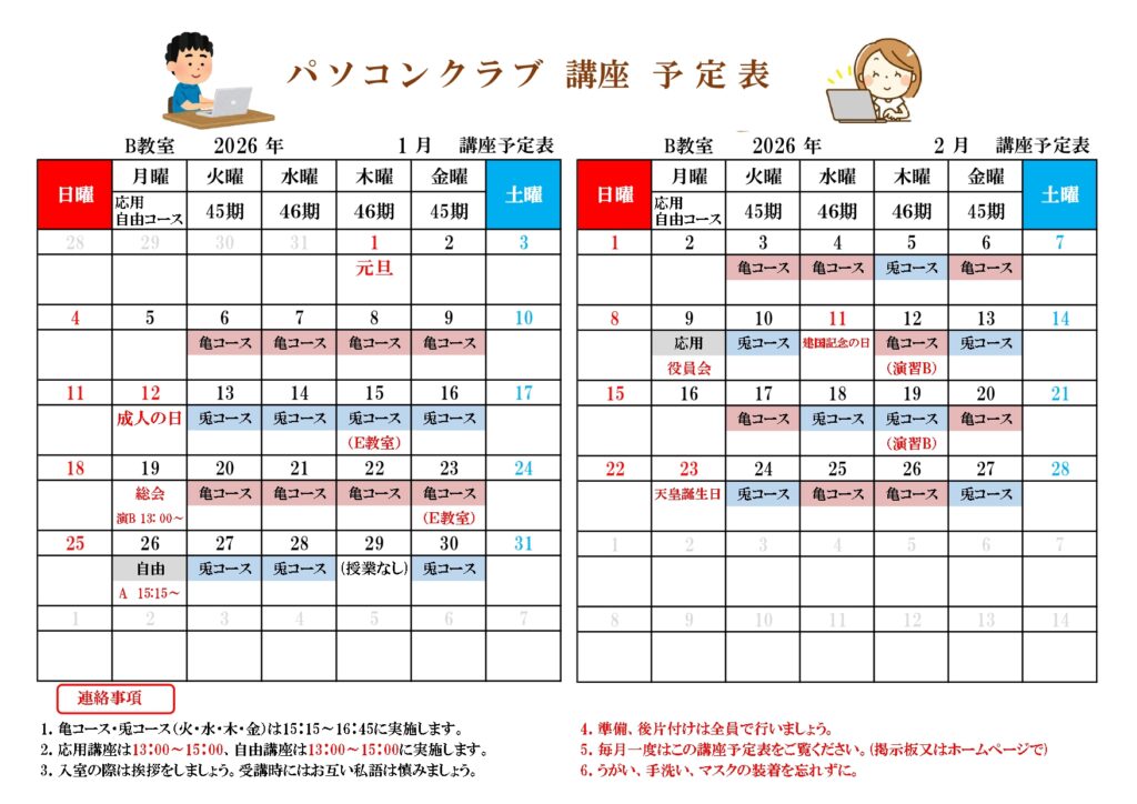 パソコンクラブ講座予定表(1月-2月)を掲載しました